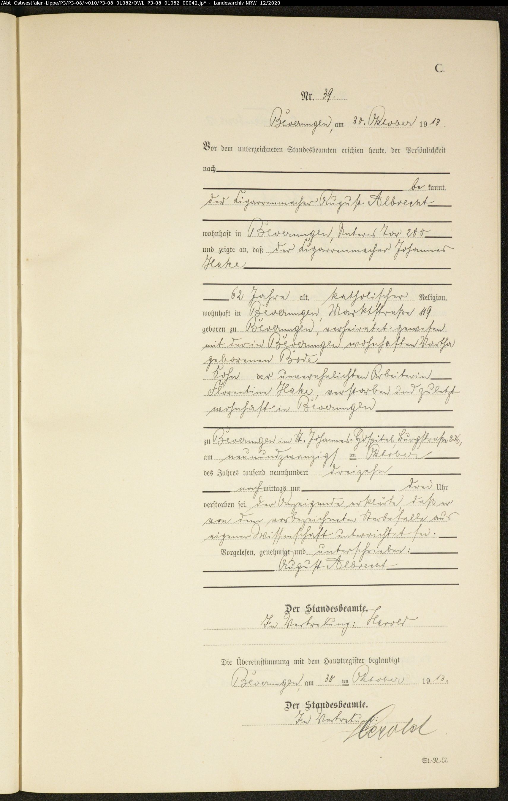 Am 21.09.1874 heiratete dort der Zigarrenmacher Johann Liborius Hake die Martha Anna Bode zu Herstelle, geboren in Groß-Bartloff in Hessen (steht so im KB), geboren am 22.11.1849.
