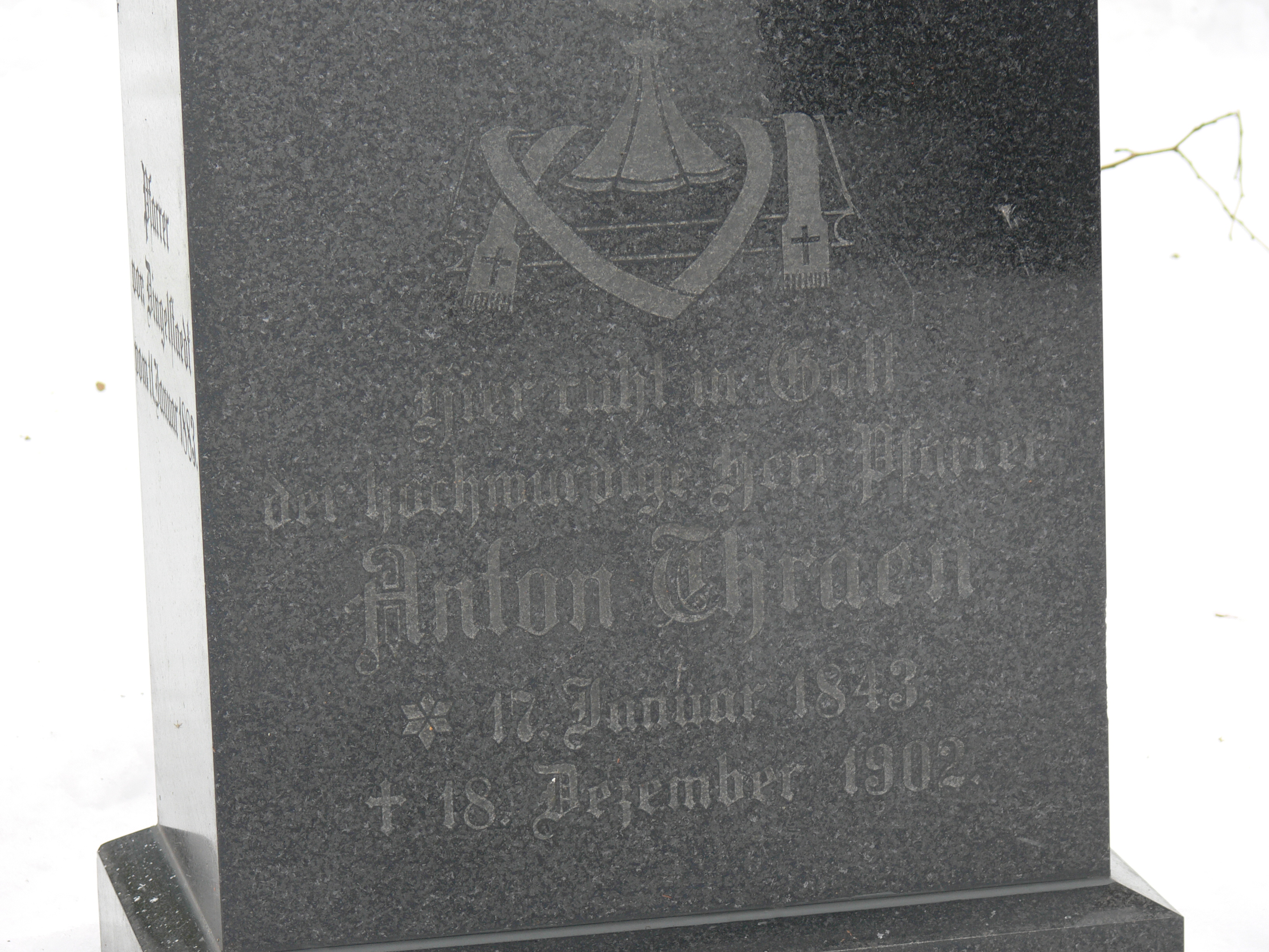 In dem Buch "Geschichte der Stadt Dingelstädt" von Aloys Schäfer steht auf Seite 186 auch ein Artikel über Anton Thraen. Der Artikel endet mit dem Satz: "Zur großen Trauer seiner Gemeinde verschied er am 9.Septbr. 1902 an den Folgen eines Magenleidens.